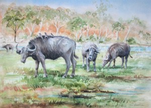 Cape Buffalo Grazing, Chobe River, Botswana, Watercolour on paper. Aavailable for sale.